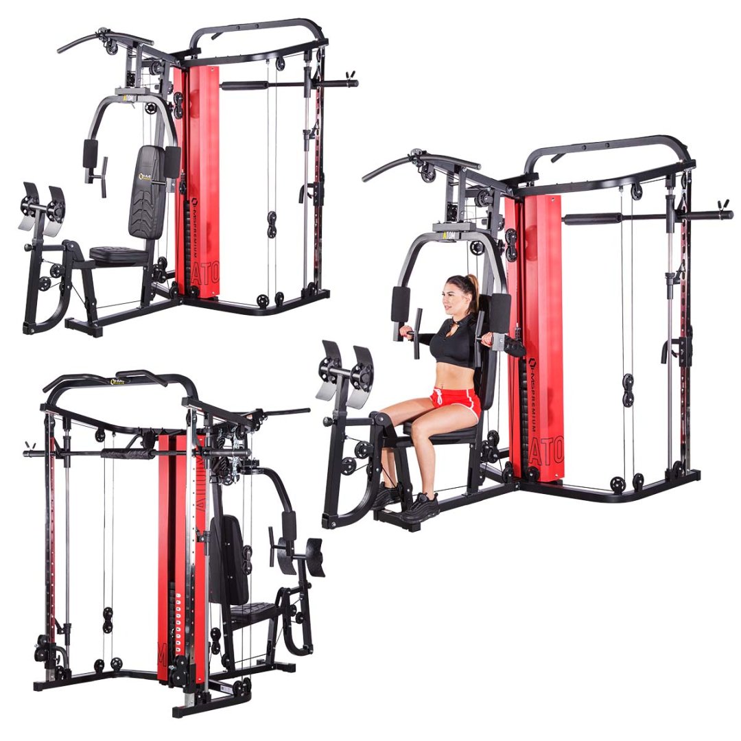 Тренажер ATOM від HMS - це комбінація мультитренажера з тренажером Сміта. Ця комбінація надає величезні можливості для тренувань і дозволяє користувачеві виконувати комплексне тренування всього тіла. Найякісніший матеріал Atom - це міцний пристрій, який буде добре працювати в будь-якому домашньому тренажерному залі. Точно виготовлені профілі з міцної сталі забезпечують стабільність і безпеку під час тренування. Міцна конструкція з увагою до кожної деталі дозволяє тренуватися двом людям одночасно. Комплексне тренування ATOM пропонує тренажер Сміта, два регульовані по висоті шківи, жим штанги, який легко трансформується в батерфляй, зону для ніг і перекладину для підтягування.